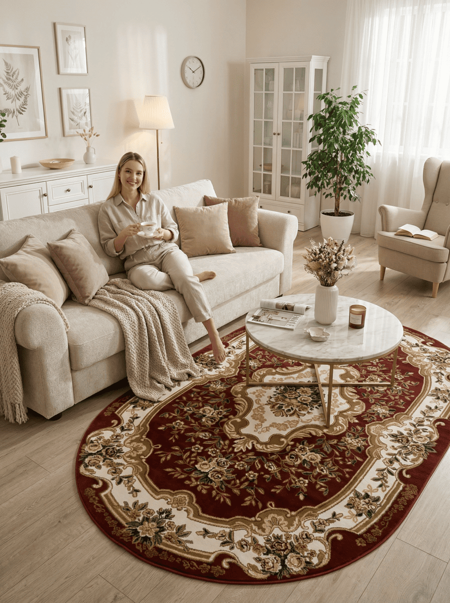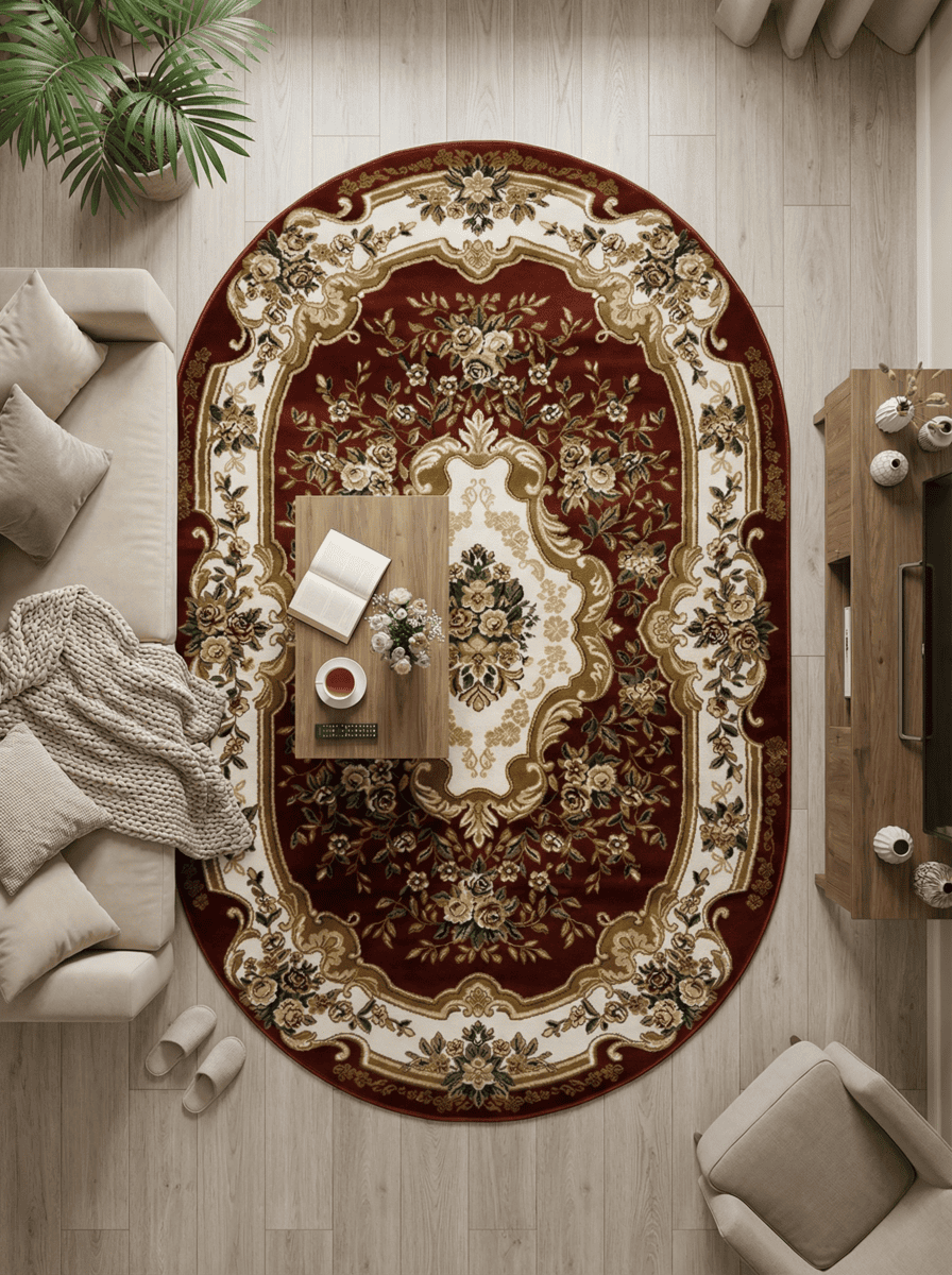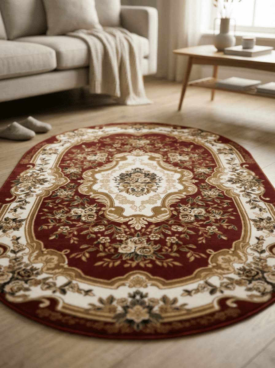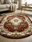 Коллекция ковров Акварель (производство Россия) включает в себя представленную модель овального бордового ковра в вариациях размеров от 0,6х1,1 до 3х4 м. Шикарное изделие из материала хит-сет плотностью 281 600 узелков на м.кв., с высотой ворса в классические 10 мм и весом – 1,65 кг на м.кв. станет дополнением к вашему дизайну. Гладкая фактура обуславливает мягкость и шелковистость. Дизайн ковра поражает роскошью. По периметру расположена узорчатая витая широкая лента, а по центру – скромный цветочный букет. В целом, ковер напоминает расшитое золотом багровое полотно с цветочным орнаментом и узорами пышного великолепия царских дворцов. Такое изделие в вашем доме подчеркнет изысканный вкус хозяина и впечатлит званых гостей.