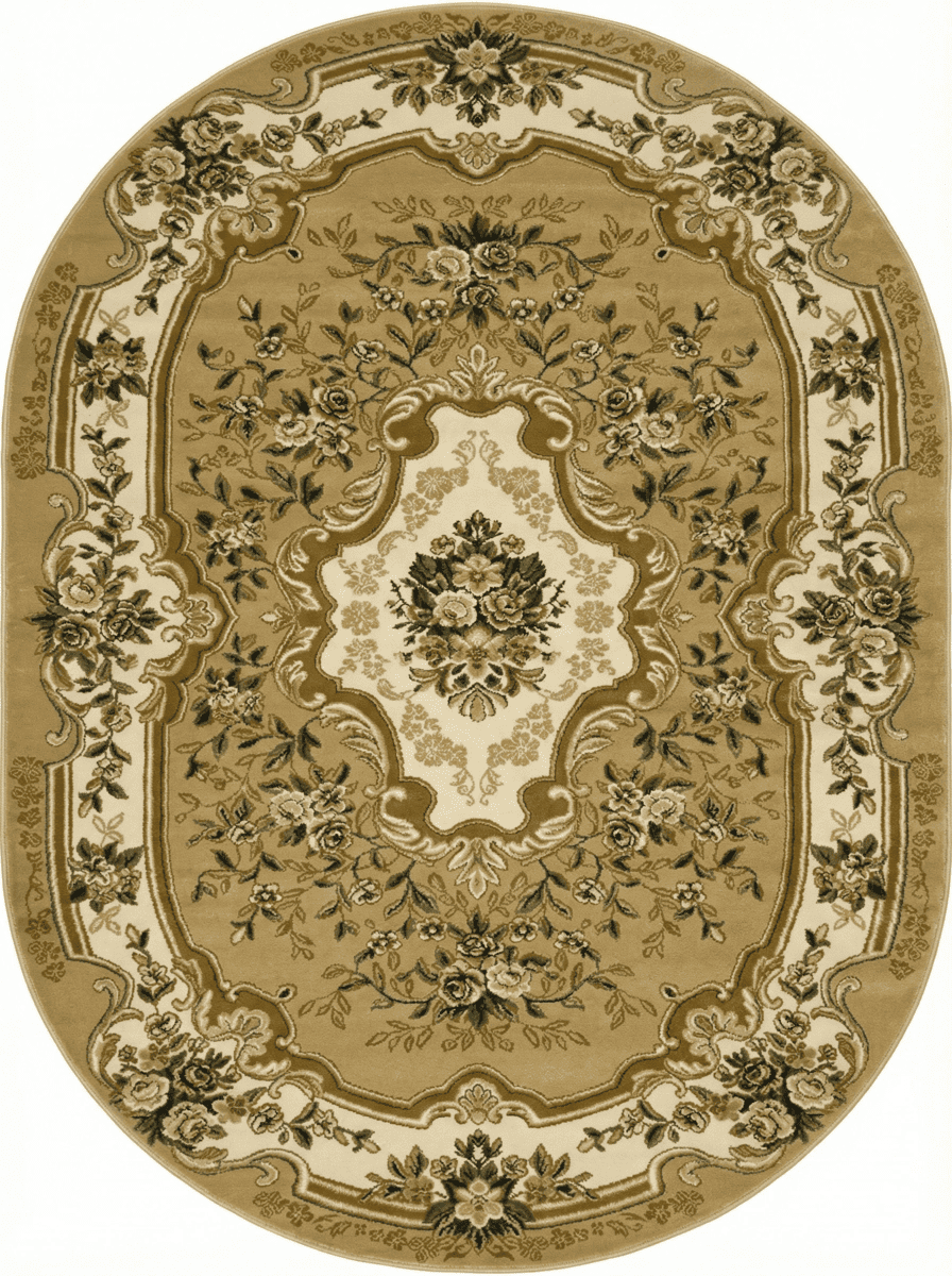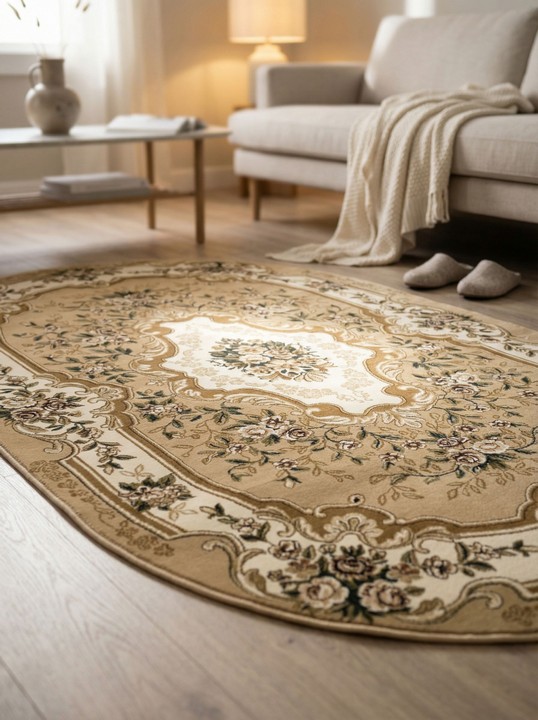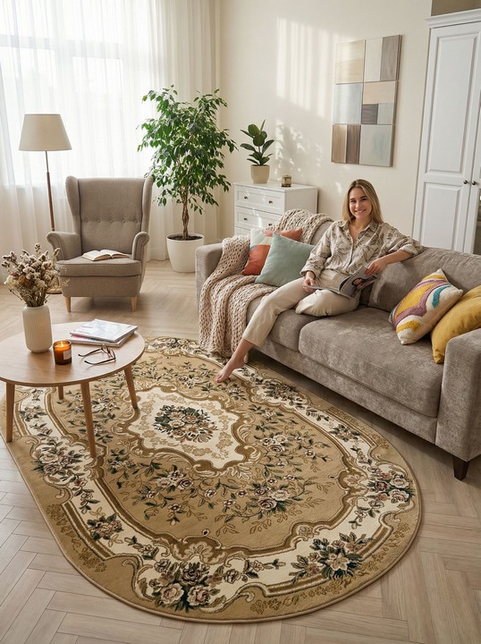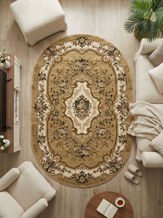 Роскошная российская коллекция Акварель предлагает покупателям овальную модель ковра пастельного бежевого цвета. Возможны разные размеры на выбор: от 0,6х1,1 до 3х5 метров. Материал изготовления — хит-сет, при плотности в 281 600 узлов на м.кв. обеспечивают надежность и прочность покрытия. А классический ворс в 10 мм и вес 1,65 кг на кв. метр дарят простоту ухода. Мягкость и шелковистость изделия достигнута благодаря гладкой фактуре. Уникальный изысканный дизайн выполнен в сдержанных тонах в пределах бежевой цветовой гаммы. Цветочные узоры симметрично расположены по всему полотну, а в центре составлена целая композиция из роскошных цветов. Рамка по краям овала выполнена из витиеватых линий, напоминающих роспись художников на холсте. Ковер наполнен домашним уютом, он принесет тепло и комфорт в ваш дом.